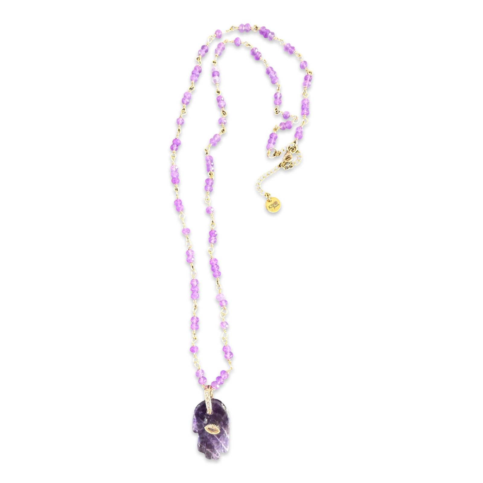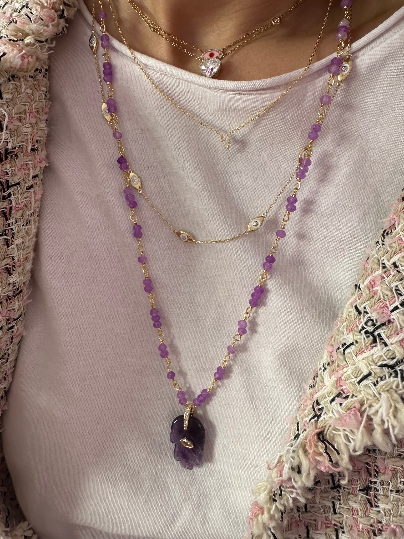 Beaded necklace with lucky Hamsa pendant in natural stone.
