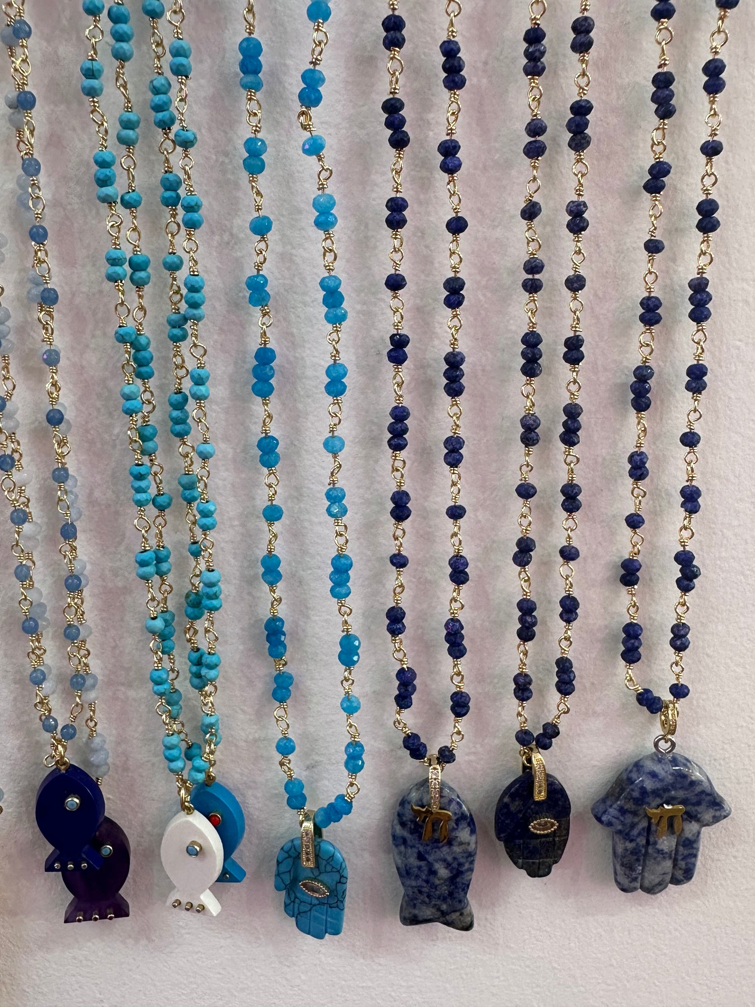 Beaded necklace with lucky Hamsa pendant in natural stone.